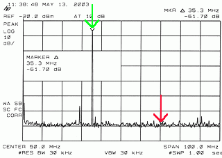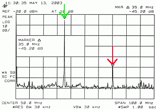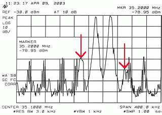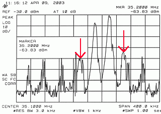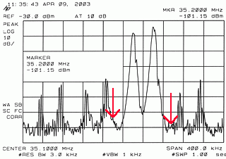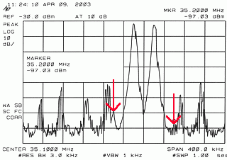 Úroveň obou rušivých signálů je asi -35 dB oproti nosné. Z obrázku je