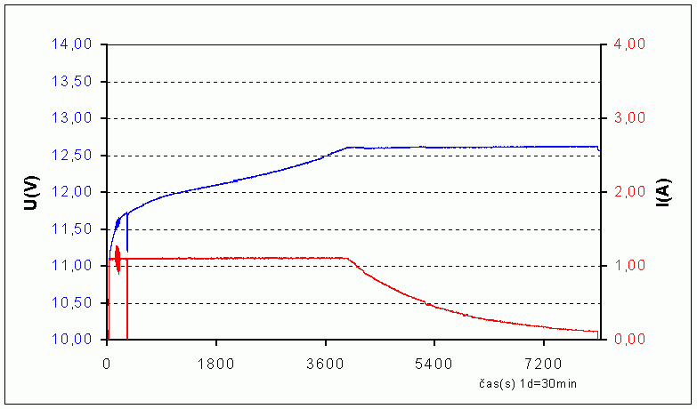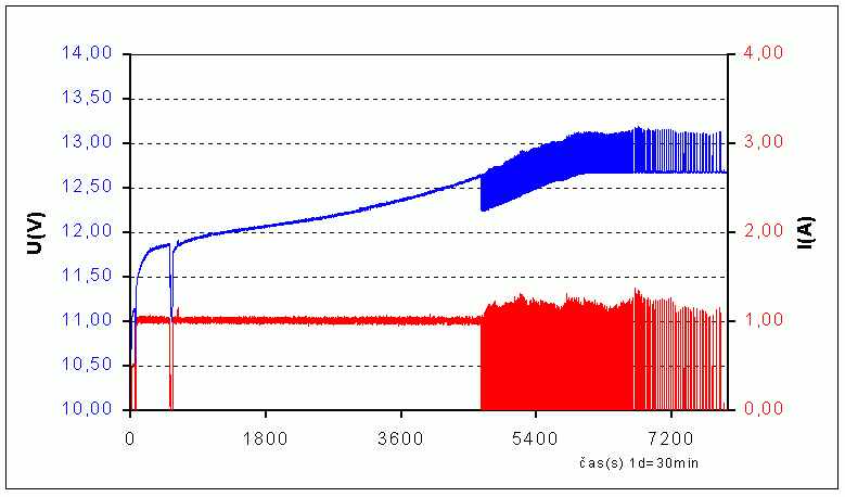 Poznámka: Měřen pouze 1 článek, viz. dále. Nabíječ nemá přesně pravoúhlou VA charakteristiku, napětí stoupá v celém průběhu nabíjení, které je tím pádem trošku delší než normálně. Přístoj je velmi