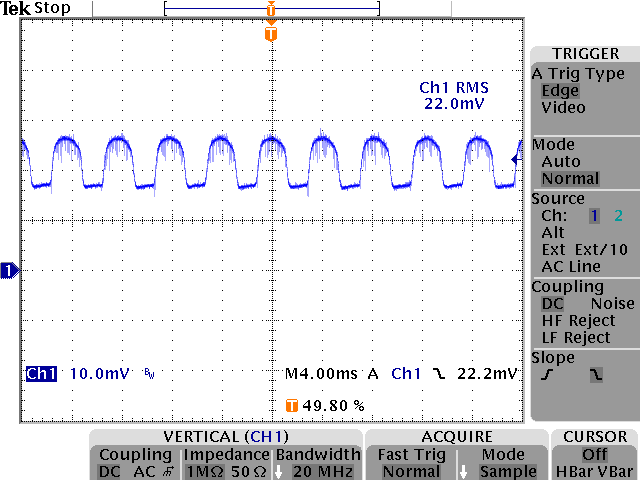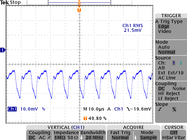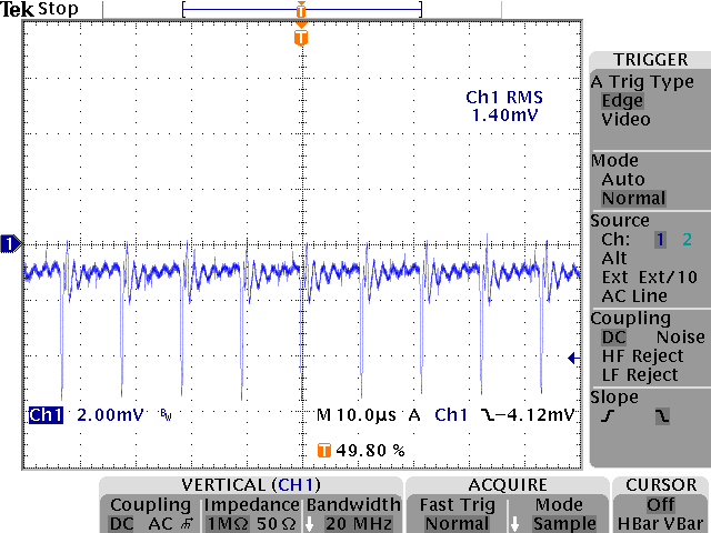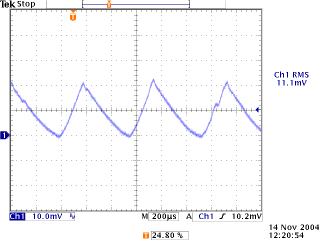 zvlnění výstupního proudu (snímací odpor 10miliohm, tj. 10mV=1A ): Na grafu je zpočátku